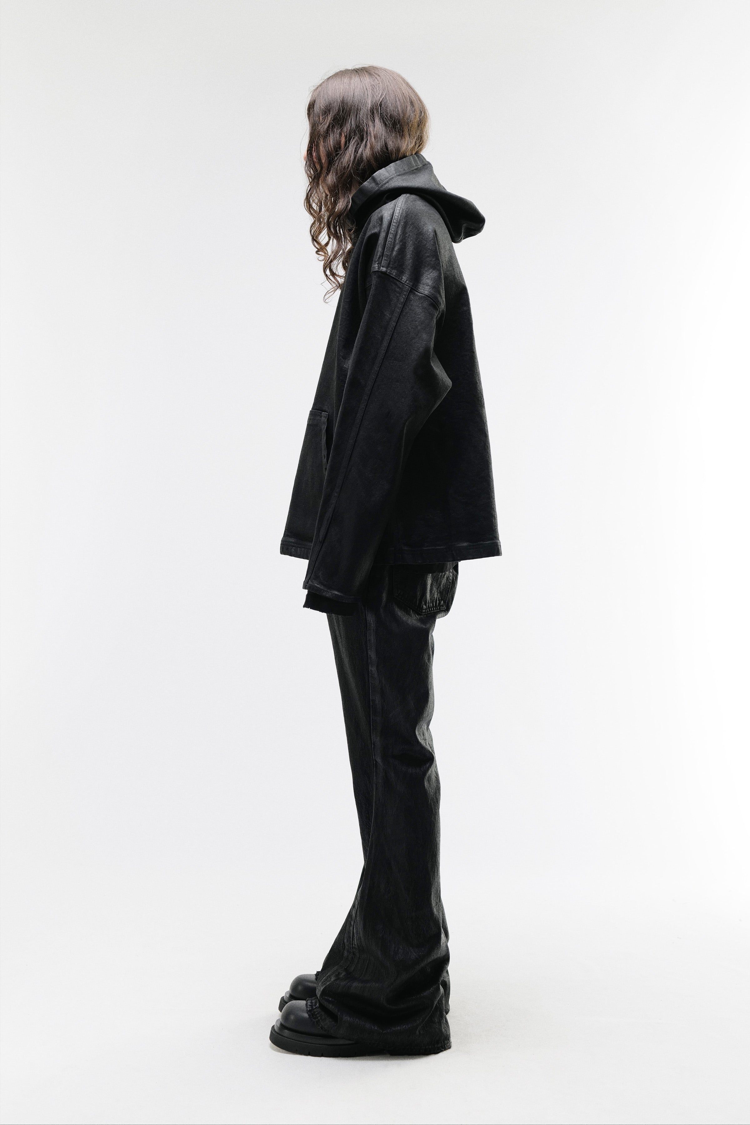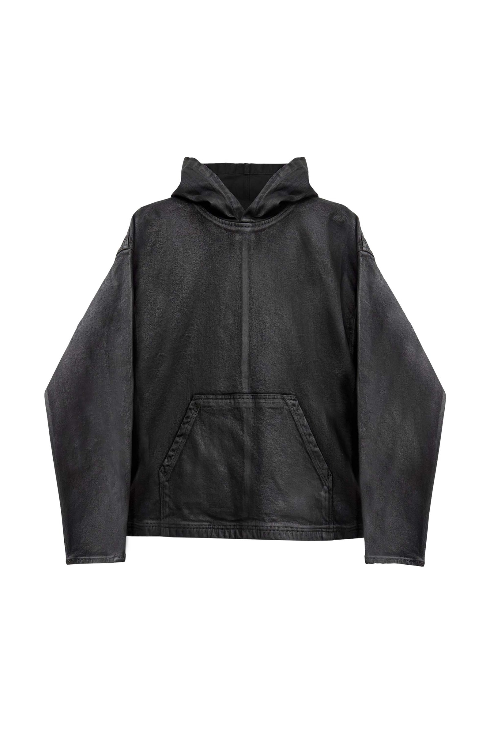 WAXED DENIM HOODIE IN 'BLACK'. KANGAROO POCKET.